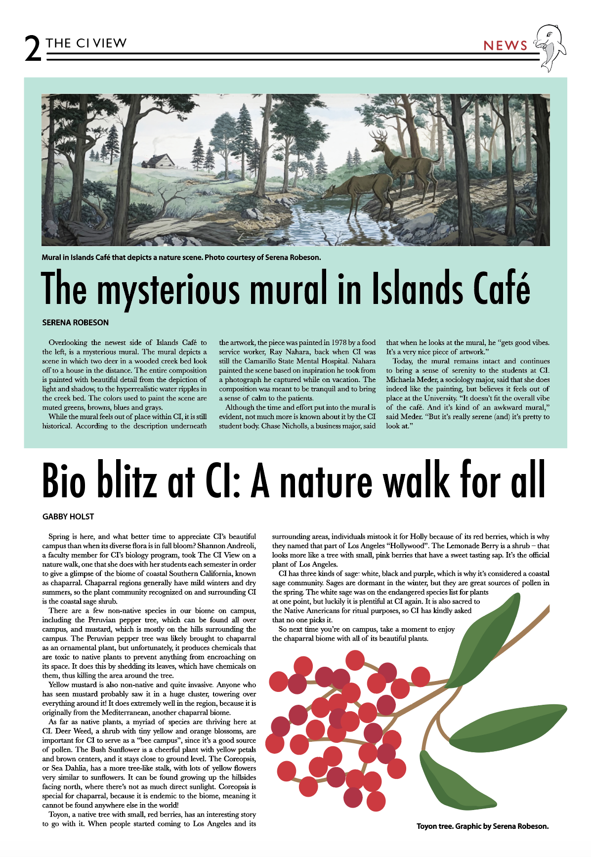 During my Bachelor of Arts in Graphic Design program, I had the pleasure of serving as the Lead Layout Designer for The CI View Student Newspaper. In this role, I developed brand guidelines and a comprehensive style guide, which my assistant and I diligently followed throughout the year. I thoroughly enjoyed collaborating with my team to visually bring their ideas to life. Additionally, I oversaw all layouts and designs before we sent the paper to press, ensuring a cohesive and polished final product.
